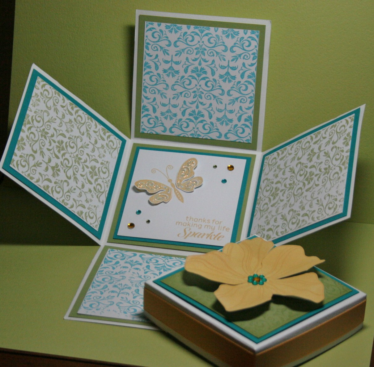 During my ramblings around the papercrafting world I stopped at the Layers of Colour blog and saw the most incredible project for something called an "exploding box".  Intrigued by this exploding box I went on a search to find good instructions on how to make one (it is really actually very simple to make) and after finding what I needed got to work.  (I apologize for not having a link to where I got the instructions from.)  I used the color combo from this weeks CR84FN challenge of teal, green and yellow.... yummy springtime colors.